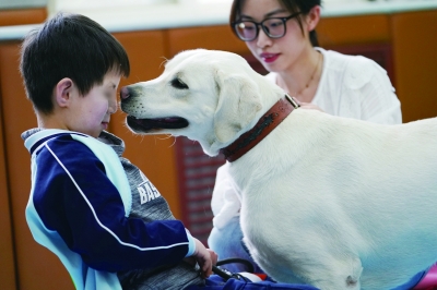 4月24日,在西安市启智学校,治愈犬“星星”和孤独症儿童互动。    自2021年下半年开始,一个治愈犬参与孤独症儿童康复的特殊教育项目在西安市启智学校正式启动。在较高淘汰率的导盲犬培训中,被淘汰的犬只,经过调整训练内容和标准后,可“转业”成为治愈犬、陪伴犬,参与特殊教育,陪伴残障儿童成长。    在该项目中,由陕西师范大学派出的教研团队和西安阳光使者导盲犬发展服务中心派出的两只治愈犬,为西安市启智学校3名孤独症学生展开每人21个学时的一对一康复训练。治愈犬不仅伴随孩子散步、玩耍,还会在绘本阅读课程中扮演角色参与互动,通过形影不离的陪伴,努力消弭他们与社会的隔阂。    新华社记者 李一博/摄