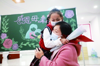 5月8日,在河北省石家庄市桥西区汇通街道东三教华城社区,东三教小学学生为妈妈送上节日祝福并和妈妈深情相拥。