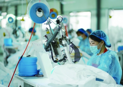 5月11日,河北超越服装有限公司工人在生产隔离服。 连日来,河北省邢台市疫情防控物资生产企业开足马力,加紧生产隔离服、防疫药品、口罩等,助力疫情防控。 新华社发(田晓丽/摄)