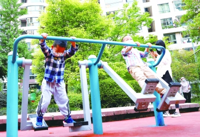 5月17日,两名男孩在上海市普陀区的一个居民小区内玩耍。 记者从5月17日举行的上海市新冠肺炎疫情防控新闻发布会上获悉,上海全市16个区都已实现社会面清零。 新华社记者 陈飞/摄