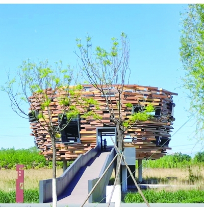 温榆河公园。抵达温榆河公园时约是上午9点多,远远看到一片高地上黄灿灿的貌似油菜花田,可惜入园需要48小时核酸证明,我没有只能望园却步了。温榆河公园面积很大,相当于6.5个奥林匹克森林公园,分成东园和西园两个园区。不能进入我们就沿着公园外围骑行,看有没有“突破口”,突然就看到了公园里文艺范十足的茑屋,远远望去外观很像个鸟窝,其实是西园的制高点之一,也是一座生态观鸟塔,游客可以登塔尽情观鸟、观湖、观园。