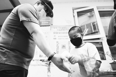 5月22日,在北京市东城区同福夹道2号院,小志愿者袁梓轩为进入社区的人员检测体温。袁梓轩是灯市口小学一年级的学生,马上要加入少年先锋队的他觉得,少先队员就应该带头做一些对社会有贡献的事情。在妈妈的鼓励下,袁梓轩加入了社区志愿者的行列,在抗疫战线上贡献自己的力量。