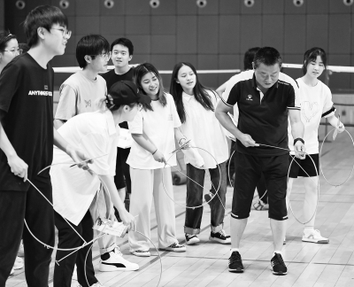 5月23日,在四川大学江安校区体育馆,体育老师在指导学生体验传统体育项目滚铁环。 近日,四川大学选取蹴鞠、投壶、木射、滚铁环、踢毽子等中华传统体育项目纳入体育课堂。全校本科生将在四周的时间内,采取通关盖章的方式,分年级、分批次在体育课上体验这些传统体育项目。此外,在四川大学江安校区体育馆的活动区域,还布置了多种传统体育运动的史料展板供学生们参观阅览。四川大学此次选取进课堂的这几个传统体育项目普及性强、参与度高,旨在通过传统体育运动“链接”体育文化和当代青年,让传统运动焕发新活力。 新华社记者 王曦/摄