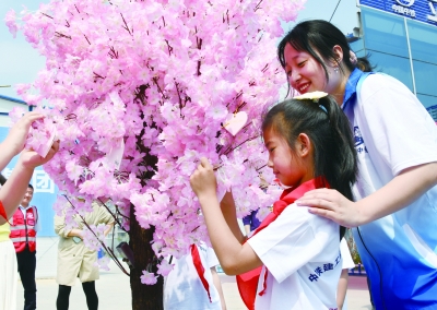 5月29日,中铁建工白沙湾足球基地项目工地,一名小女孩在“知心姐姐”陪护下系上自己的“微心愿”。 当日,共青团青岛市委在中铁建工一项目工地举行“益路童行 结对帮扶”主题活动。活动邀请部分农民工子女以及项目周边乡镇困难儿童走进建设工地,观看文艺演出,体验科技产品,参与游戏互动等,并帮助部分孩子实现其“微心愿”,迎接“六一”儿童节的到来。 新华社记者 李紫恒/摄