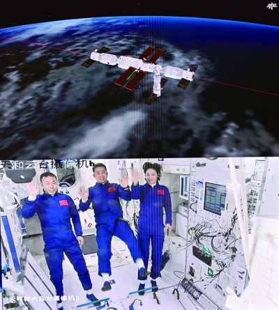▲ 6月5日在北京航天飞行控制中心拍摄的进驻天和核心舱的航天员陈冬(中)、刘洋(右)、蔡旭哲向全国人民挥手致意的画面。
