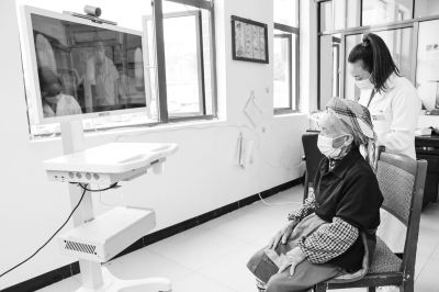 6月7日,在龙里县龙山镇团结村卫生室,村医陈莉(右)协助村民陈志珍通过远程诊断系统问诊。