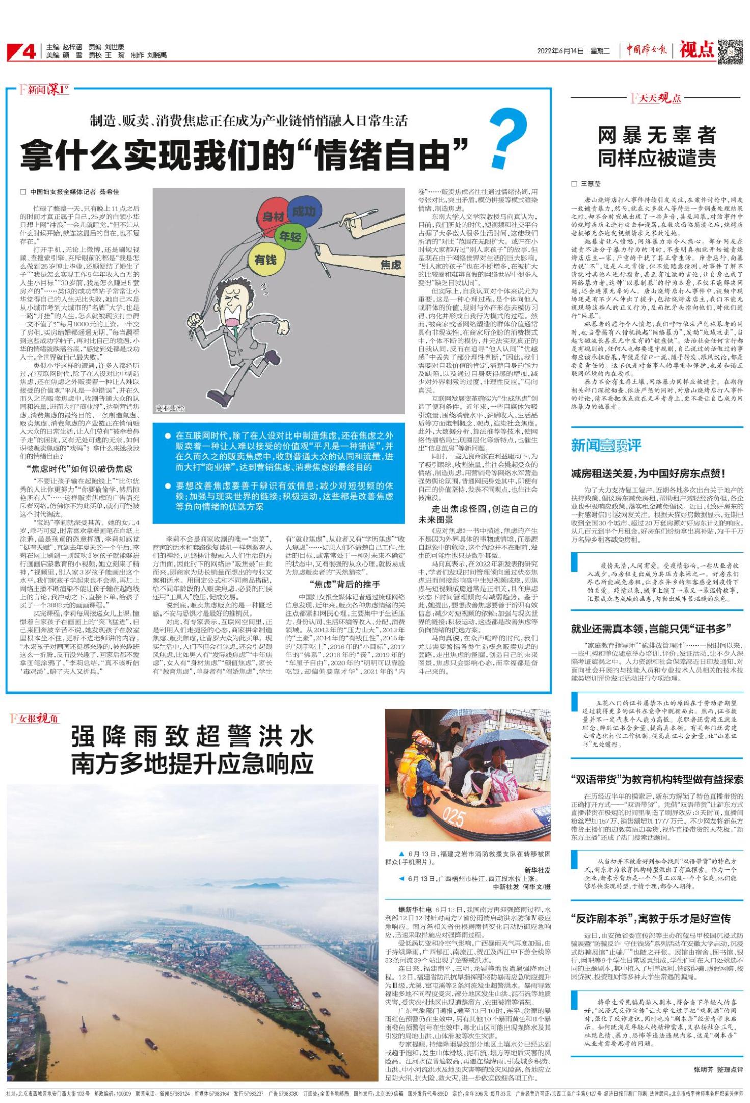 《中国妇女报》(电子版)的一切内容(包括但不限于文字、图片、PDF、图表、标志、标识、商标、版面设计、专栏目录与名称、内容分类标准以及为读者提供的任何信息)仅供中国妇女报读者阅读、学习研究使用,未经中国妇女报及/或相关权利人书面授权,任何单位及个人不得将《中国妇女报》(电子版)所登载、发布的内容用于商业性目的,包括但不限于转载、复制、发行、制作光盘、数据库、触摸展示等行为方式,或将之在非本站所属的服务器上作镜像。否则,中国妇女报将采取包括但不限于网上公示、向有关部门举报、诉讼等一切合法手段,追究侵权者的法律责任。