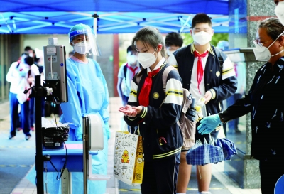 6月13日,上海市格致初级中学的初三学生在入校时进行手部消毒。    当日,上海全市初三年级学生返校复学。    新华社记者 刘颖/摄