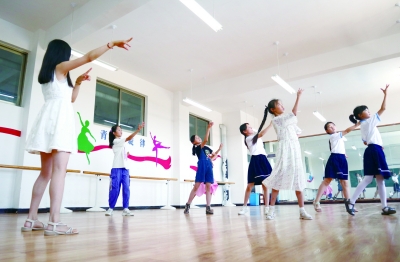 6月16日,在山东省单县黄岗镇乡村“复兴少年宫”的舞蹈活动室,孩子们在少年宫辅导员的指导下练习舞蹈。