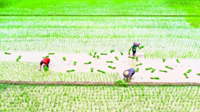 6月19日,湖南省常宁市胜桥镇港子口村农民在插秧(无人机照片)。“三夏”时节,各地农民抢抓农时忙夏种,田间地头一派忙碌景象。