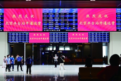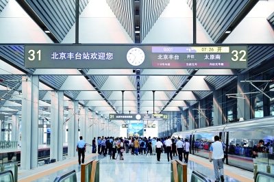 墙壁上陶板工艺烧制的钟楼、鼓楼壁画突出北京元素;中央光庭的背漆玻璃中,运用3D打印技术设置百米长卷,将北京山川地貌、代表性车站、名胜古迹等嵌于其中,寓意盛世太平。“无缝”换乘城市交通,人性化、便捷的旅客服务系统,覆盖全站的无障碍设施……畅通融合、绿色温馨、经济艺术、智能便捷的“外表”和“内涵”,让北京丰台站成为首都新的地标。