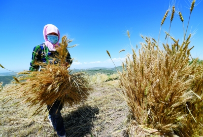 7月3日,宁夏固原市原州区炭山乡炭山村村民将收割的冬小麦打捆。