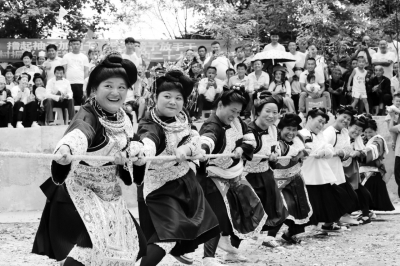 7月4日,在贵州省黔东南苗族侗族自治州榕江县忠诚镇高文苗寨,苗族妇女在拔河比赛欢度“六月六”。当日是农历六月初六,高文苗寨邀请周边苗族村寨芦笙队到寨上做客,人们欢聚一堂,开展吹芦笙、跳芦笙舞、斗牛、拔河等活动,欢度民族传统节日“六月六”,祈求人畜安康、五谷丰登。