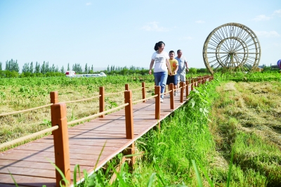 游客在韦桥村游览(7月5日摄)。近年来,位于黄河岸边的宁夏青铜峡市大坝镇韦桥村依托引黄古灌区世界灌溉工程遗产和黄河水利、生态资源优势,发展农业观光、农事体验、农耕文化等产业,逐步走出一条村美业兴的农旅融合发展之路。