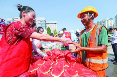 7月13日,浙江省湖州市德清县武康街道组织开展“送清凉进工地”活动,为辖区建筑工地的工人送去清凉汤、水果以及防暑药品等,让他们在炎炎夏日感受清凉和关怀。中新社发 王树成/摄