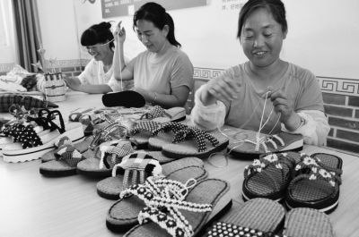 近日,在山东省聊城市东昌府区堂邑镇教场李村巧手草编工作室,几名农家女在利用玉米皮编织草拖鞋。