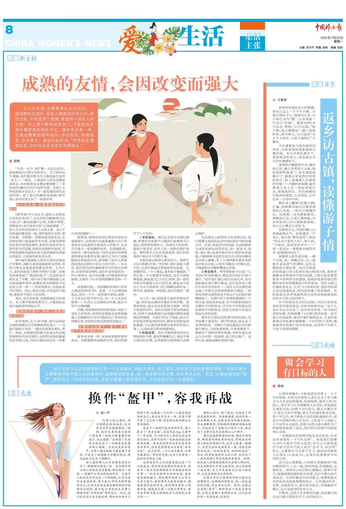 《中国妇女报》(电子版)的一切内容(包括但不限于文字、图片、PDF、图表、标志、标识、商标、版面设计、专栏目录与名称、内容分类标准以及为读者提供的任何信息)仅供中国妇女报读者阅读、学习研究使用,未经中国妇女报及/或相关权利人书面授权,任何单位及个人不得将《中国妇女报》(电子版)所登载、发布的内容用于商业性目的,包括但不限于转载、复制、发行、制作光盘、数据库、触摸展示等行为方式,或将之在非本站所属的服务器上作镜像。否则,中国妇女报将采取包括但不限于网上公示、向有关部门举报、诉讼等一切合法手段,追究侵权者的法律责任。
