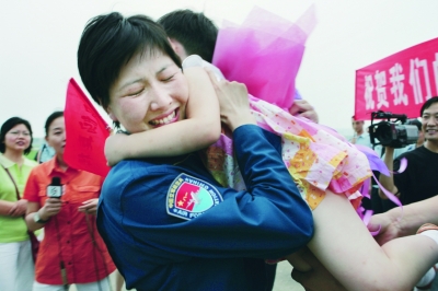 那天,我随她重返蓝天首次飞行归来。刚走下飞机,她三岁女儿瑞瑞拿着一面写着“妈妈真棒”的小旗扑了上来,文力一把搂住女儿,激动得泪流满面。