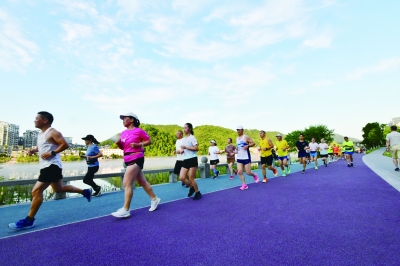 8月8日,健身爱好者在浙江省建德市新安江畔的新安绿道上跑步。