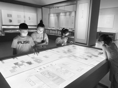 值得一提的是,四个主题展馆都设置了很多互动区,吸引着孩子们长时间逗留,让孩子们在互动玩耍中学习知识。比如,在刻有百家姓的两面墙上,孩子们兴奋地寻找自己的姓氏,轻轻一按,字块便会亮起;在“经史子集知多少”互动区,孩子们可以用手指滑动拖拽古籍至相应的“经史子集”分类框;他们还可以在限时答题活动中,测测自己的文史知识水平。