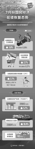 7月份,全国规模以上工业增加值同比增长3.8%;全国服务业生产指数同比增长0.6%。社会消费品零售总额同比增长2.7%,全国固定资产投资(不含农户)环比增长0.16%,货物进出口总额同比增长16.6%。