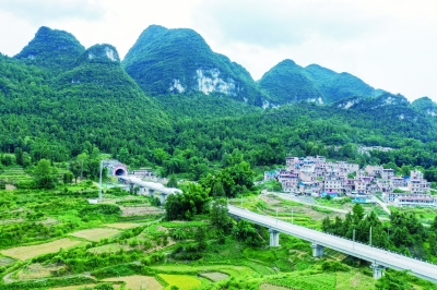 这是8月16日拍摄的位于广西环江毛南族自治县的贵南高铁九万大山四号隧道(无人机照片)。    8月17日,位于广西环江毛南族自治县的贵南高铁九万大山四号隧道顺利贯通。至此,贵南高铁全线108座隧道全部贯通,为线路开通奠定基础。贵南高铁九万大山四号隧道全长15485米,是贵南高铁广西段最长的一级高风险隧道。建设中的贵南高铁是我国“八纵八横”高速铁路主通道包头至海口通道的重要组成部分,设计时速350公里,全线预计2023年底开通运营。
