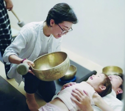 在北京的一家声音疗愈工作室里,回旋着悠长的颂钵声。10多个人享受着各种专业乐器带来的振动频率和旋律。李艳的手指轻轻穿梭在各个乐器之间,用平和轻柔的声音引导顾客放松冥想。在多种乐器频率的交织中,顾客的表情越来越放松,有人甚至发出了轻微的呼噜声。
