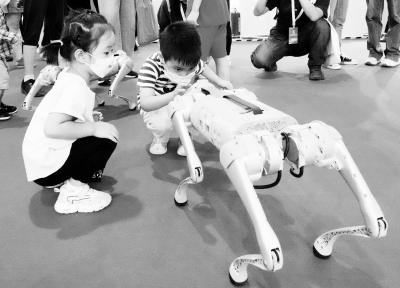 8月18日,两名小朋友在观看“机器狗”。 当日,2022世界机器人博览会开幕。本届博览会展览面积达4万平方米,共有130余家企业携500余件展品亮相,30余款全球首发新品将在博览会现场集中发布。