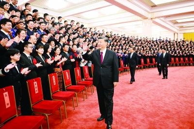 上午11时,习近平等来到人民大会堂北大厅,全场响起热烈掌声。习近平等走到代表们中间,同大家亲切交流并合影留念。
