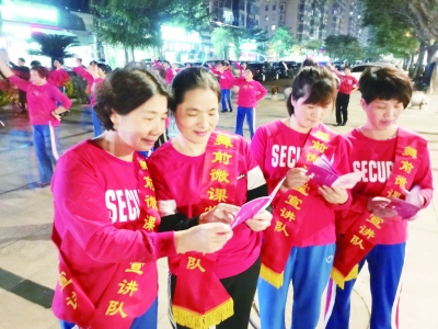 福州市妇联将党的十九届六中全会精神、政府中心工作、移风易俗、垃圾分类、家庭教育等知识汇编成口袋书,印发给广场舞队伍的姐妹们,利用舞前热身、舞间休息时段,在各个广场舞队伍中开启“舞前微课堂”宣讲活动,由优秀广场舞领队、执委开展宣讲,用正确的舆论、鲜明的立场引领广场舞队伍的妇女姐妹们。