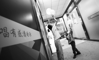 8月29日,在北京市海淀区,羊羊(化名,右)和淼淼(化名)在录音教室外玩耍。 9月5日是中华慈善日。近日,北京新阳光慈善基金会联合社会公益慈善团体,组织“病房学校”的白血病患儿与少年儿童一同献唱公益歌曲《愿你被这世界温柔以待》,并一起绘制尤克里里,写祝福语,为白血病患儿加油鼓劲。