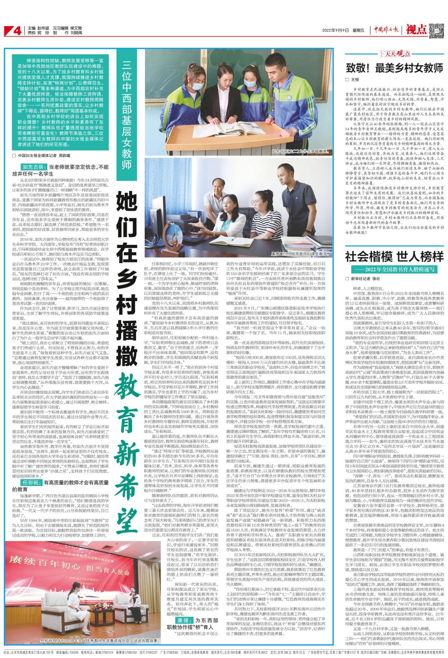 在中西部乡村学校的讲台上如何实现职业理想?乡村教师的水平和素养有了怎样的提升?教师队伍扩量提质给当地学校带来哪些可喜变化?教师节来临之际,三位中西部基层女教师向中国妇女报全媒体记者讲述了她们的所见所感。