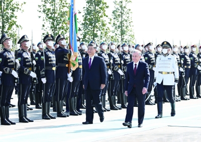 当地时间9月15日,国家主席习近平在撒马尔罕同乌兹别克斯坦总统米尔济约耶夫会谈。会谈前,米尔济约耶夫为习近平举行隆重欢迎仪式。    新华社记者 申宏/摄
