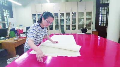 “古籍修复对刷子的掌控要求很高,如果刷纸时控制不好力道,纸可能会破;但如果太轻,纸又黏不住。装帧也有很多不同的形式,不知道怎么装,就谈不上怎么修。”宋晶说,这些全都靠练。
