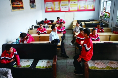 左下图为陵川县盲人曲艺宣传队的队员们在排练室聊天。