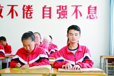 右下图为陵川县盲人曲艺宣传队的队员们在学习盲文。