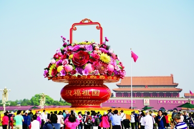 9月26日,北京市天安门广场中心花坛和长安街14处主题花坛全部完工。天安门广场中心“祝福祖国”巨型花果篮,顶高18米,以喜庆的花果篮为主景。篮内主花材选取了十种花卉和十种水果象征十全十美,体现花团锦簇、硕果累累喜迎二十大的美好寓意。市民专程前来观赏“祝福祖国”花坛,迎接国庆节到来。中国妇女报全媒体记者 杨睿/摄