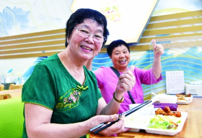 9月27日,在福州市华大街道屏山社区,71岁的黄庆萍(左)和73岁的钱美英为可口的午餐点赞。 近年来,福建省福州市创新打造养老服务品牌,推广“9点钟课桌11点钟饭桌”运营模式,在满足老年人一餐一饭需求基础上,积极营造发展业余爱好、丰富精神生活的重要空间,带动居家社区养老服务水平不断提升。新华社记者 魏培全/摄