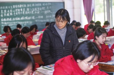 2020年12月,云南丽江华坪女子高级中学的校长张桂梅(中)在教室里检查学生上课情况。
