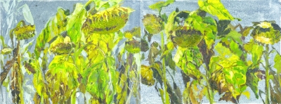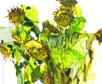 “写生是与自然的对话,是倾听后的表达。在选取创作素材时,相比于插在花瓶里的花朵,我喜欢生命力更顽强、可以抵抗粗劣的生存环境、生长空间更开阔的植物,比如向日葵、仙人掌。而向日葵局部与整片的宏大气势各具不同美感,并且无论是灿烂向阳生长,还是成熟饱满花头低垂、几至枯残成干葵,不同状态都枝干挺直,枝叶婀娜。成熟的向日葵,也有生命孕育的感觉,我画向日葵融入的是对女性的观察与认知……在艺术作品中,我喜欢‘借景而非直陈’的表达,更愿意用隐喻的方式来体现对事物的看法,比如戏剧或植物等,将对环境、社会、生活和人的关注,用隐喻的方式在作品中表达出来。”