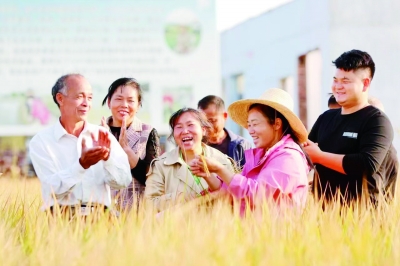 阳光下,一片金黄色的稻田在风中沙沙作响,一辆辆收割机来回穿梭,一粒粒饱满的稻谷被收入“囊中”。大家一边向稻田里走去,一边继续热烈讨论,欢笑声、赞叹声在稻田里久久回荡。