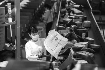 11月10日,在湖南省永州市蓝山县一家物流企业,工作人员在分拣快递。