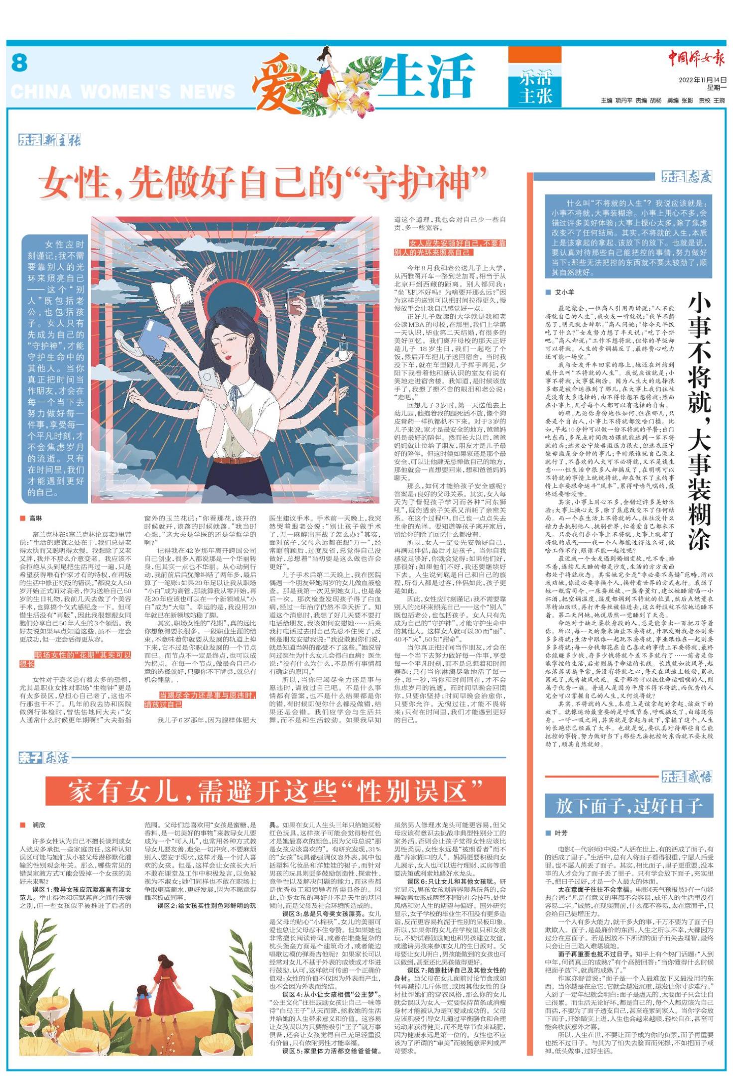 《中国妇女报》(电子版)的一切内容(包括但不限于文字、图片、PDF、图表、标志、标识、商标、版面设计、专栏目录与名称、内容分类标准以及为读者提供的任何信息)仅供中国妇女报读者阅读、学习研究使用,未经中国妇女报及/或相关权利人书面授权,任何单位及个人不得将《中国妇女报》(电子版)所登载、发布的内容用于商业性目的,包括但不限于转载、复制、发行、制作光盘、数据库、触摸展示等行为方式,或将之在非本站所属的服务器上作镜像。否则,中国妇女报将采取包括但不限于网上公示、向有关部门举报、诉讼等一切合法手段,追究侵权者的法律责任。