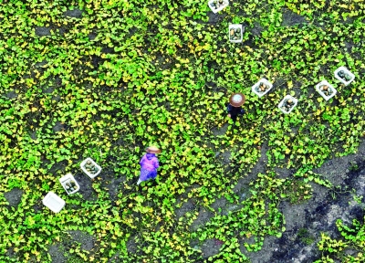 11月22日,湖南省永州市道县一蔬菜基地,农户在采收南瓜(无人机照片)。当日是小雪节气,各地农民抢抓农时,进行农作物种植、管护、采收等农事活动。 新华社发(蒋克青/摄)