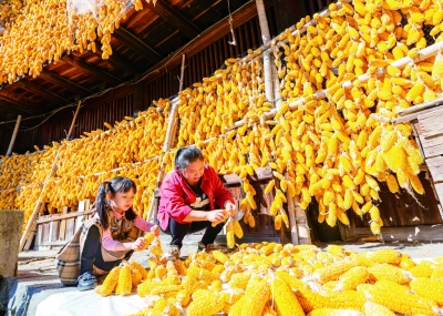 11月29日,漳州市南靖县梅林镇梅林村村民在土楼里晾晒玉米。初冬时节,福建省漳州市南靖县梅林镇梅林村迎来玉米收获季,村民们趁着晴好天气晾晒玉米。近年来,南靖县梅林镇发挥地理优势,大力推广玉米种植,以产业兴旺带动乡村振兴。    新华社发(张旭/摄)