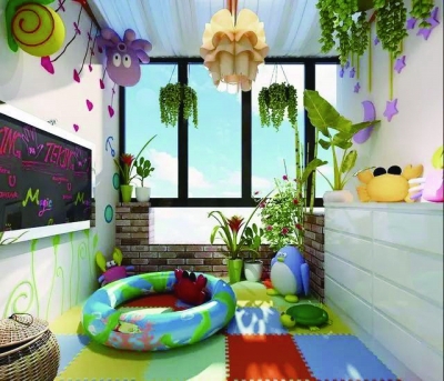 阳台变身孩子的游乐园。在阳台上摆放柔软小沙发和圆几,铺上卡通地毯,放置一些如秋千、滑梯等迷你设施和玩具,可给孩子游戏、交流提供充足的开放空间,使得孩子在家也拥有一处快乐放松的迷你游乐园。