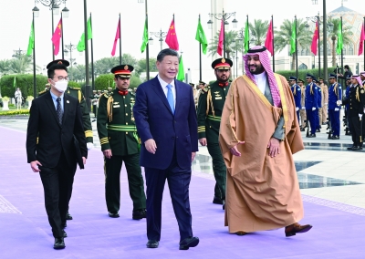 沙特王储兼首相穆罕默德在下车处热情迎接。两国领导人步入检阅亭,王宫军乐团奏中沙两国国歌。习近平在穆罕默德王储陪同下检阅王宫仪仗队。沙特王宫卫队以传统执剑礼仪向习近平表示最隆重欢迎。