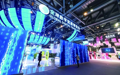这是12月11日在杭州国际博览中心拍摄的首届全球数字贸易博览会现场。 12月11日至14日,首届全球数字贸易博览会在浙江省杭州市举行。本届数贸会以“数字贸易 商通全球”为主题,展会面积8万平方米。数贸会汇聚了境内外800余家数字贸易头部企业,参会来宾可以现场参观汽车自动驾驶、态势感知一体机等诸多新技术、新产品。