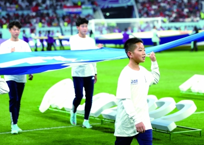 金粲璨(前)在卡塔尔世界杯三、四名决赛开赛前作为护旗手出场(12月17日摄)。    来自中国贵州省黔东南苗族侗族自治州丹寨县的12岁苗族少年金粲璨怎么也不会想到,在12月17日、18日的卡塔尔世界杯季军和冠军争夺战中,他能以护旗手的身份登上两场球赛的绿茵场。   受父亲影响,金粲璨从小就喜欢足球。2018年,父亲把金粲璨送到当地足球俱乐部,正式开启了他的学球之路。今年,在国际足联和万达集团共同发起的“星星之火”项目助力下,金粲璨作为中国少年的一员顺利入选,成为卡塔尔世界杯的护旗手。
