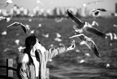 12月23日,一名游客在昆明滇池海埂公园里喂红嘴鸥。 近期,随着滇池最佳观鸥季的到来,不少游客来到昆明滇池边观鸥,享受红嘴鸥带来的乐趣。